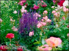 Компаньонами для роз могут быть разнообразные многолетники с различной окраской цветков. В зависимости от высоты растущих в саду групп и сортов роз и их окраски, можно подобрать для них наиболее подходящие по окраске цветков многолетники в соответствии с предпочтениями садовода. Но поскольку селекционеры пока не вывели голубые и синие розы, в любом розарии прекрасно …