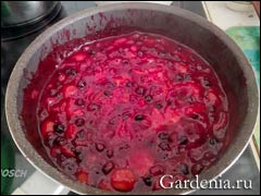 Когда содержимое кастрюли закипает, кладем в неё второй бокал ягод и фруктов. И далее весь этот процесс повторяется.